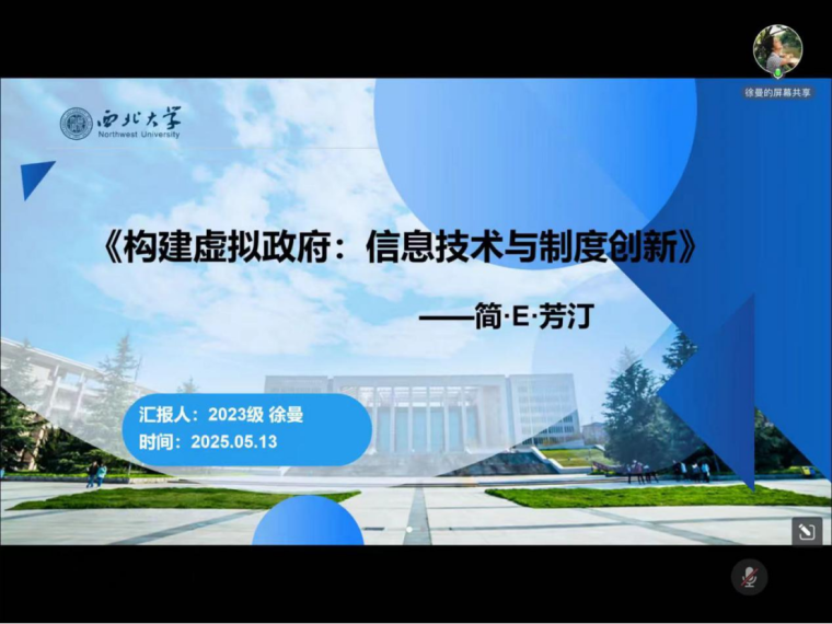 2023级行政管理专业硕士研究生徐曼分享的书籍是简·E·芳汀的《构建虚拟政府:信息技术与制度创新》,她分别从作者简介和写作背景、主要内容概括、核心观点梳理以及阅读感悟与思考四个方面展开。首先,她简要介绍了作者简·芳汀教授以及此书在学术界的影响力,该书被誉为是“研究信息时代政府治理的里程碑式著作”。其次,她将本书的写作背景概括为“对信息技术发展热的一种冷思考”。该书指出当前各国虚拟政府、数字政府构建实际困难重重,因为信息技术对各国政府部门革命性改造的潜力并未充分发挥。接着她概括了本书的主要内容,即围绕技术执行的分析框架所进行的详细阐述及论证支持。作者关注的焦点在于信息技术、组织、内嵌性及制度等之间的关系,在此基础上提炼出了本书的核心概念,即客观技术和执行技术,而执行技术就是影响技术与制度的中介因素。她分享了技术执行框架的三个普遍命题,分别是“被执行的技术不同于客观的技术”“即使技术的执行没有理性或最佳地使用技术,组织的行动者还是倾向于按重塑、加强现行社会制度的方式来执行新技术”“更具远见和创业精神的专业人员可能用因特网来发展新的能力或者新的网络化的组织形式”。最后她从信息壁垒和政府改革两个方面举例,指出技术执行分析框架为我们思考技术赋能提供了一个思路,在认识到技术赋能可能性和有效性的前提下,管理者可以通过调整制度安排和组织安排去影响技术的执行,使制度和组织形式更加适应技术的发展,为技术赋能提供良好的制度和组织环境,使技术的潜力得到充分发挥。