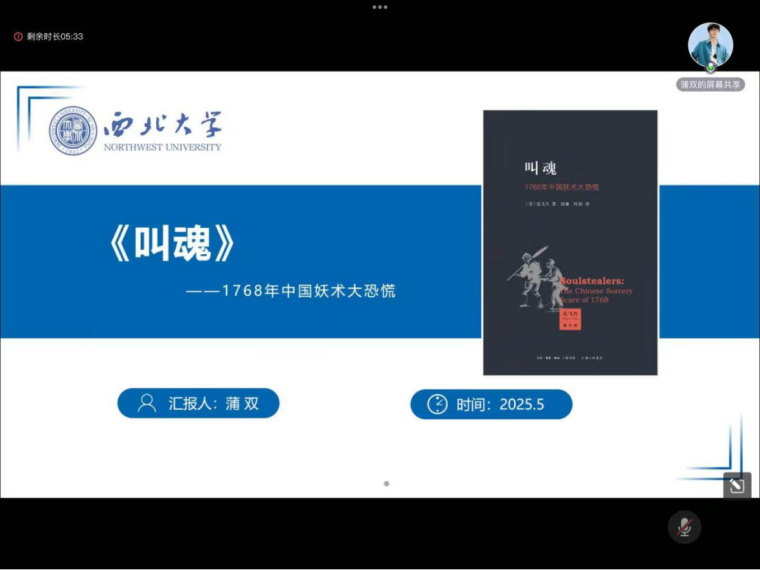郑冰茹博士对蒲双同学的分享进行点评。她提到《叫魂》作为汉学研究的一本书,突破了传统历史研究的范式,以小见大,将一个看似荒诞的民间事件,升华为对整个中国传统社会运行机制的深度剖析。书中展现出的孔飞力严谨的史料分析能力和独特的问题意识,令人钦佩。通过对 “叫魂” 事件的抽丝剥茧,不仅能看到清朝中期的社会百态,更能从中领悟权力如何塑造社会认知,群体心理又如何影响历史走向。是一本既具趣味性又具学术性的优秀作品。