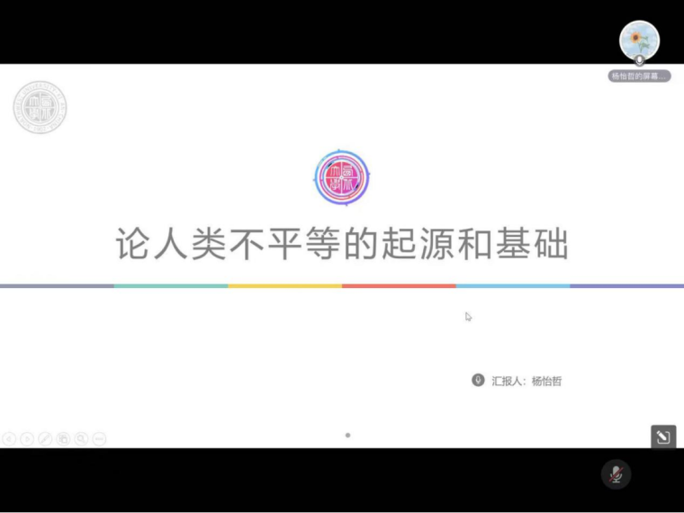 郑冰茹博士对杨怡哲同学的汇报作出点评。一方面,她对汇报同学充分的准备工作表示了充分的肯定,指出汇报的内容全面、逻辑清晰、引用例证;另一方面,郑冰茹博士也指出效率与公平的问题贯穿于人类社会发展的始终,鼓励同学们可以深入思考效率与公平的关系,结合实际情况探索解决不平等问题的有效途径。