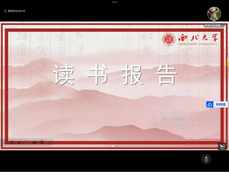 2023级社会保障专业的硕士研究生商倩云同学分享的书籍是项飙老师所著的《跨越边界的社区:北京浙江村的生活史》。她从书籍的作者简介、写作背景、著书逻辑、研究方法以及分析鉴赏等维度进行了深入的解读。首先介绍了作者的学术背景和研究动机,让我们对作者有了更全面的了解。她详细阐述了作者如何通过长达数年的田野调查,深入北京“浙江村”的生活,记录了这个特殊社区的历史变迁和社会结构。在著书逻辑部分,向我们展示了作者是如何构建起分析“浙江村”框架,以及如何通过丰富的第一手资料来支撑他的理论分析。她对书中的每个章节都进行了细致的解读,让我们对“浙江村”的社会运作、文化特色以及与外部世界的互动有了更深刻的认识。同时,特别强调了书中对于“浙江村”形成、发展和变迁的深入分析,以及对于“浙江村人”在北京的生活、生产经营、乡情民愿以及与流入地及户籍所在地管理部门的互动的详细描述。这些内容不仅为我们理解城市化进程中的社会融合和社区发展提供了宝贵的视角,而且对于理解当代中国社会的多元性和复杂性具有重要意义。在研究方法部分,她向我们详细介绍了作者是如何开展质性研究的,为我们展现了做好一份研究的应有之义。最后总结了这本书对于理解中国社会变迁和社区发展的深远影响,以及“跨越边界”对处于社会转型期的个体和社会结构的本质意义。