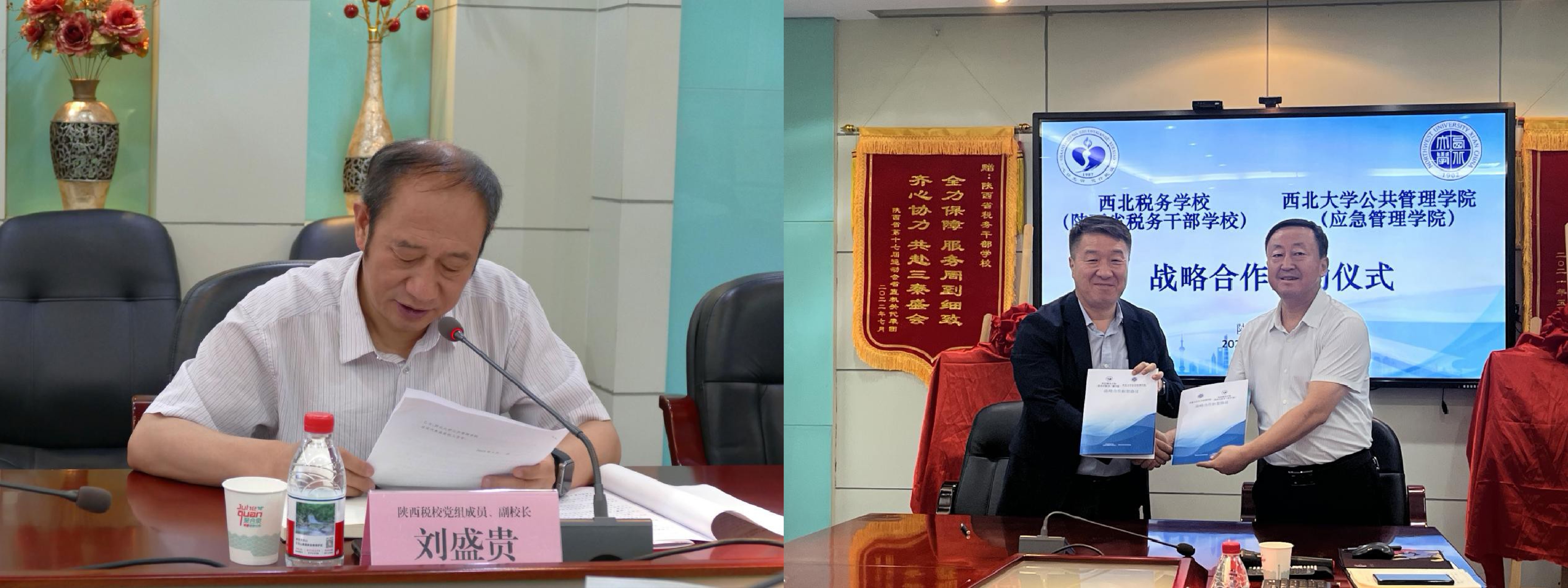 2025年5月30日下午,西北大学565net必赢与陕西省税务干部学校战略合作协议签约仪式在陕西省税务干部学校博学楼隆重举行。我院党委书记窦争光、院长雷晓康、副院长靳洪涛、社会保障系主任吴玉锋、培训中心主任蔡辉,与陕西省税务干部学校党组书记、校长刘峰,党组成员副校长晁海翔、党组成员副校长刘盛贵及各部门负责人共同出席仪式,仪式由陕西省税务干部学校晁海翔副校长主持。