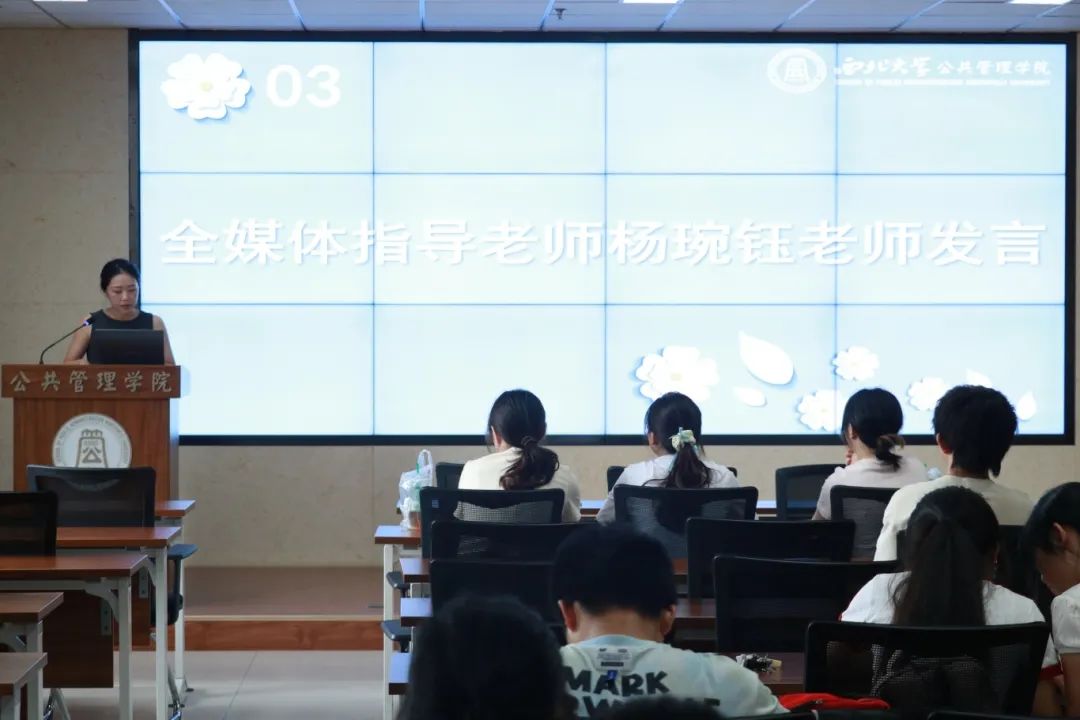 胡彦堃指出,在过去的一年中,全媒体各组成员在杨琬钰老师的指导下,紧密合作、上下协同,积极主动地完成工作,并取得了丰硕的成果。接着她对全媒体上一学年的工作成果进行了汇报总结。她对学院公众号文章阅读量、视频播放量、官网访问量等数据进行了总结,指出在过去一年里,全媒体中心在完成学院公众号、视频号、官方网站日常运营的同时,也打造了许多特色品牌,收获了热烈反响,在塑造学院整体形象和宣传学院文化建设等方面发挥了重要作用。大家相互配合,以饱满的热情、严谨的态度获得了广泛的肯定。随后,她真诚地感谢团队成员们能够为建设全媒体中心而全力以赴,也欣喜于学弟学妹们的成长、蜕变。最后,她由衷地感激全媒体中心这个良好的平台,给了她锻炼、进步的机会,也希望全媒体中心在未来能够更加蒸蒸日上。