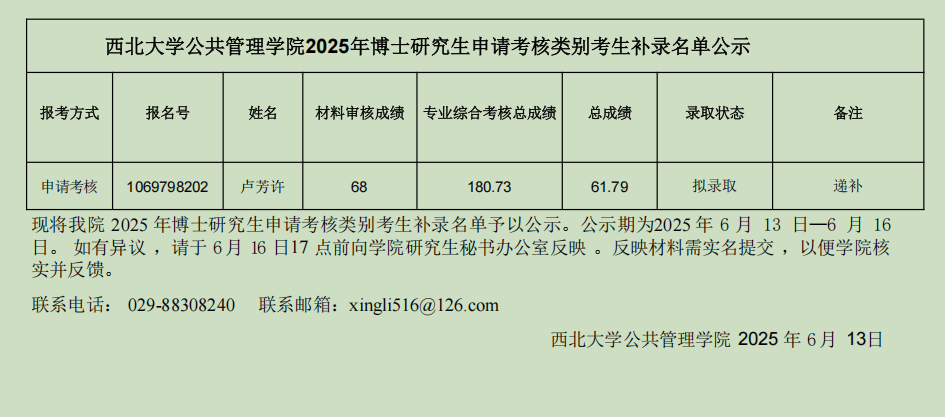 西北大学565net必赢2025年博士研究生申请考核类别考生补录名单公示