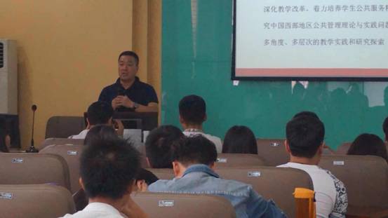 宣讲会第一项,由雷晓康教授向同学们详细介绍了我院的科研平台与学术团队。首先,雷老师从地域环境、经济条件和学术氛围等方面分析了我院研究生培养的优势和特色,并着重介绍了我院的教学与科研发展历程。其次,雷老师具体介绍了我院的专业,包括5大系、7个本科专业、1个博士学位授权点、4个硕士一级学科、5个硕士二级学科、1个专业硕士学位等。随后,还详细介绍了我院代表性科研项目,其中包括院系老师的大量国家社科基金和教育部人文教科基金项目。接着重点介绍了我院各个专业的优秀教师,如行政管理专业梁忠民教授、学院院长曹蓉教授、 张正军教授;社会保障席恒教授、 雷晓康教授、 许琳教授等。同学们聆听十分认真,不时地记下自己关注的专业情况,以及各学科方向的导师队伍、科研方向、研究特色、研究成果和历届毕业生就业等基本情况。最后,雷晓康教授展示了我院研究生的优秀论文和丰富的课外活动,同学们表达出了浓厚的兴趣与热情。