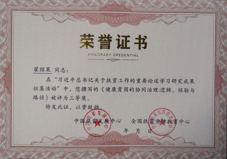 2020年9月27由国务院扶贫办中国扶贫发展中心、全国扶贫宣传教育中心联合主办的“习近平扶贫论述研究成果征集交流研讨会暨习近平扶贫论述系列研究工作结项会”在北京会议中心举办。会上公布了习近平扶贫论述研究成果获奖名单并进行了颁奖。我院翟绍果教授撰写的论文《健康贫困的协同治理:逻辑、经验与路径》获得三等奖。