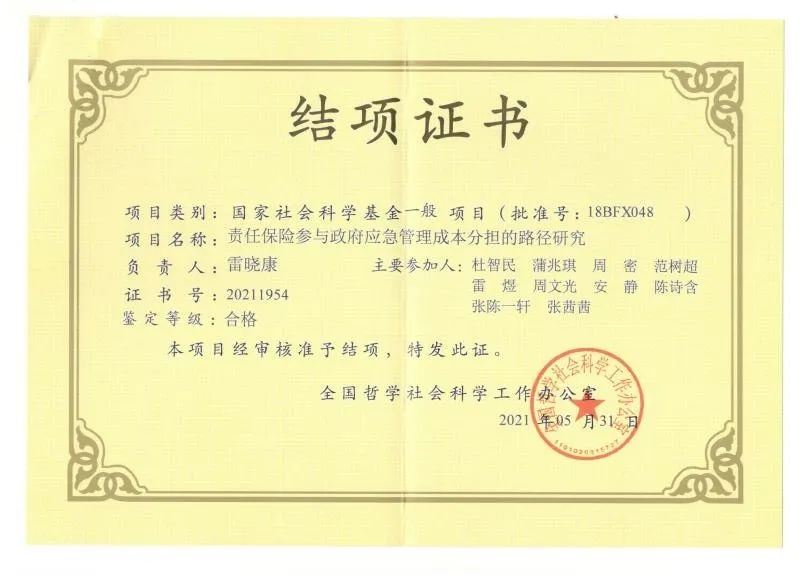 雷晓康教授主持的国家社科基金《责任保险参与政府应急管理成本分担的路径研究》顺利结项