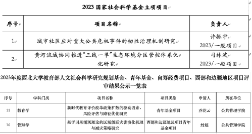 2023年全院获批国家社科基金面上项目2项,教育部项目2项,陕西省社科基金2项,陕西省科技计划(软科学)项目6项,西安市社科基金3项,省社科联青年项目1项,省社科联重点智库研究项目1项,陕西蓝皮书合作研究项目1项,省应急管理科技创新课题3项,国家部委、省市厅局等横向项目20余项。