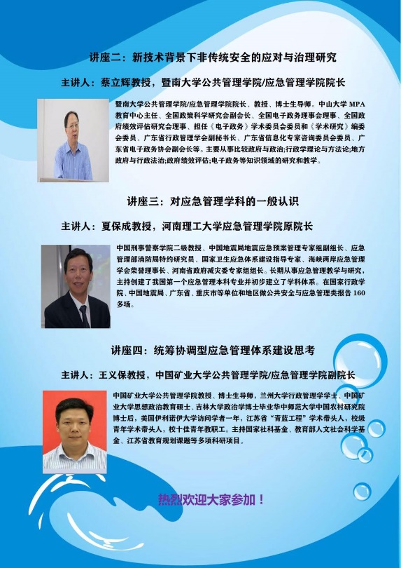 6月10日上午,公共管理学术前沿讲座(第128期)暨应急管理学院成立系列讲座在西北大学太白校区钟健报告厅与腾讯会议(线上)同步举行。主讲嘉宾有南京大学社会风险和公共危机管理研究中心主任童星教授、暨南大学565net必赢/应急管理学院院长蔡立辉教授、河南理工大学应急管理学院原院长夏保成教授、中国矿业大学565net必赢/应急管理学院副院长王义保教授。讲座由我院副院长翟绍果教授主持。线上线下共计150余位校内外专家学者及师生参加了本次研讨会。
