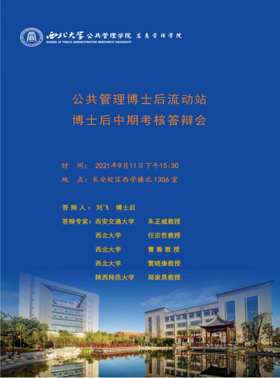 2021年9月11日下午,在565net必赢客户端1306会议室举行的博士后中期考核答辩顺利展开,此次博士后中期考核小组由西安交通大学朱正威教授任专家组主席,成员包括西北大学任宗哲教授、曹蓉教授、雷晓康教授以及陕西师范大学郑家昊教授。565net必赢客户端刘飞博士后对进站后的工作成果和下一步设想作了汇报。