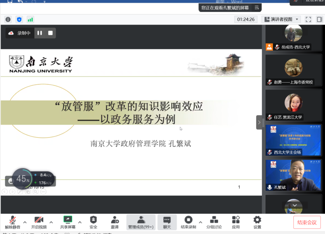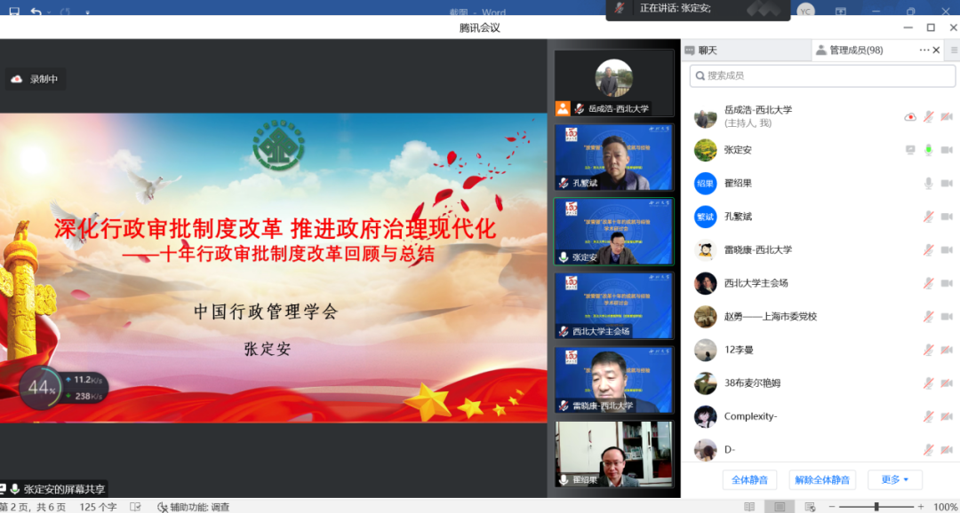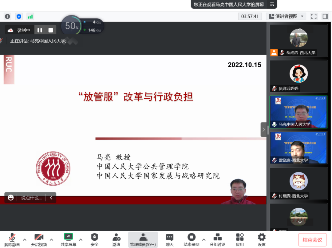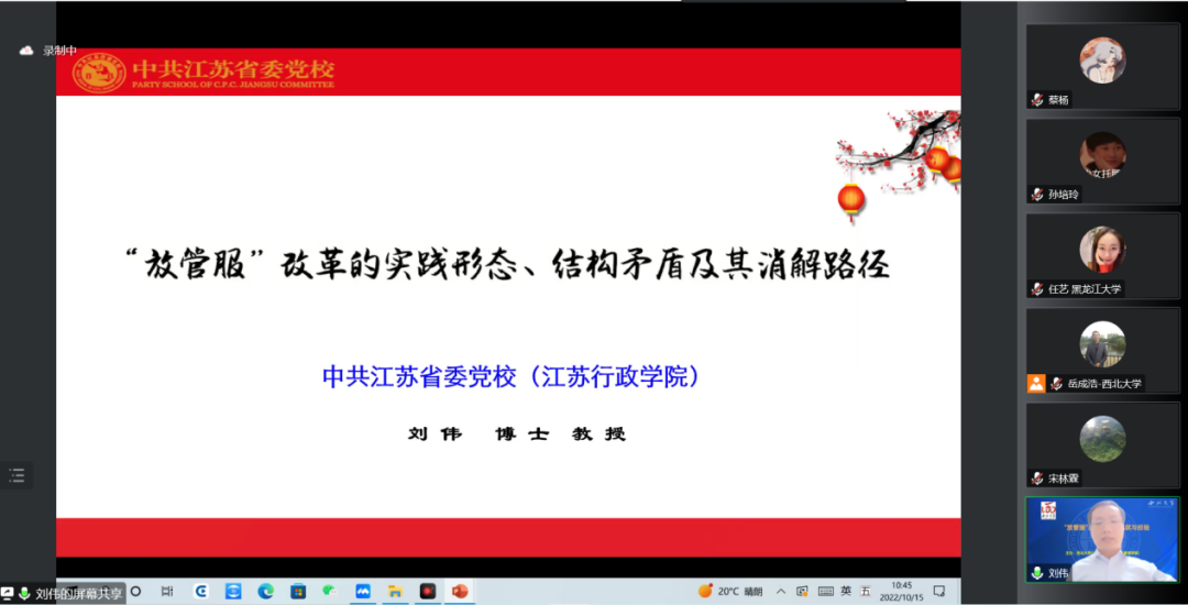 2022年10月15日,由565net必赢客户端主办、张凤阳教授名家工作室协办的“‘放管服’改革十年的成就与经验学术研讨会”借助腾讯会议在线成功举办。来自中国行政管理学会、南京大学、上海市委党校(上海行政学院)、江苏省委党校(江苏行政学院)、天津师范大学、中国人民大学、西北大学、陕西师范大学、西北工业大学、四川大学、山东大学、兰州大学、郑州大学、湖南大学、华东政法大学、南京理工大学、南京航空航天大学、中南大学、中国人民公安大学、中南财经政法大学、黑龙江大学、新疆大学、福建师范大学、山西财经大学、西北政法大学、重庆师范大学、西南民族大学、山东师范大学、中国地质大学、包头医学院、宝鸡文理学院、吉林财经大学、广东外语外贸大学、上海海关学院、西安思源学院、中央党校、甘肃省委党校等近40所高校与科研单位的200多名师生在线参加了本次研讨会。