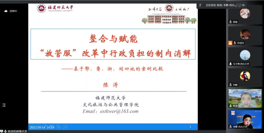 福建师范大学文化旅游与565net必赢陈涛讲师作了题为“整合与赋能:‘放管服’改革中行政负担的制内消解”的主题报告。陈涛讲师的汇报共分为五部分,第一部分是问题的提出:行政负担的反向转化;第二部分是提升行政效能:行政负担的制内消解,他先提出了研究假设,阐述了“行政效能”的含义,并在分析现有消解行政负担的基础上提出了适应性治理、技术性治理、无缝隙治理与整体性治理这四种模式;在第三部分,他进一步以福建福州“一栋楼办公”、湖北巴东“办事不出村”、浙江衢州“最多跑一次”、山东平原“一次就办好”这四个案例对上述提升行政效能的四种模式做了案例分析,在第四部分,他分析了行政效能小结行政负担的逻辑和效应;在汇报的最后一部分,他做了本次汇报的总结和讨论。