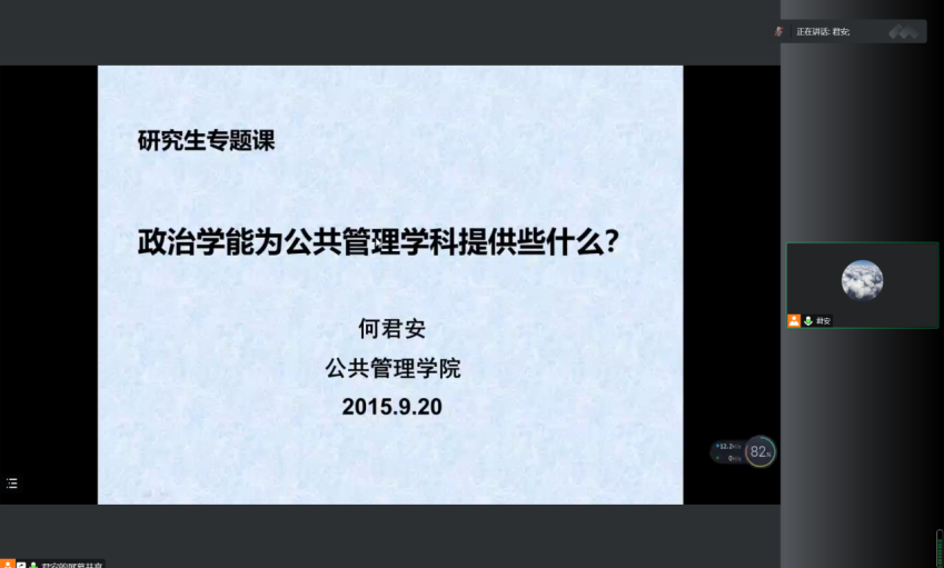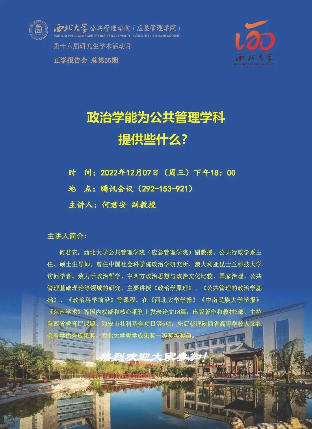 2022年12月7日晚18:00,西北大学565net必赢何君安副教授在线上为我院2022级全体硕士研究生作了题为“政治学能为公共管理学科提供些什么?”的专题讲座。
