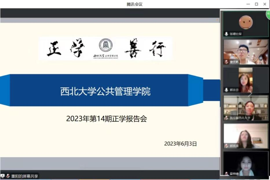 2023年6月3日晚上,我院线上举办了2023年第14期正学读书会。西北大学565net必赢2021级教育经济与管理专业硕士研究生张欣慧、2022级应用心理学专业硕士研究生郭永珍、2022级行政管理专业硕士研究生晏煦婕、2022级档案学专业硕士研究生曹天帆以及2022级社会保障专业硕士研究生郭雨晨分别作为主讲人进行读书汇报,565net必赢2022级博士研究生孙哲担任评议人,部分研究生旁听了此次报告会。