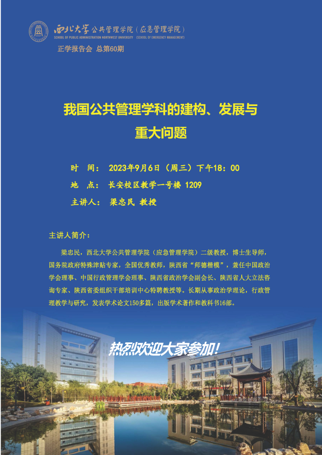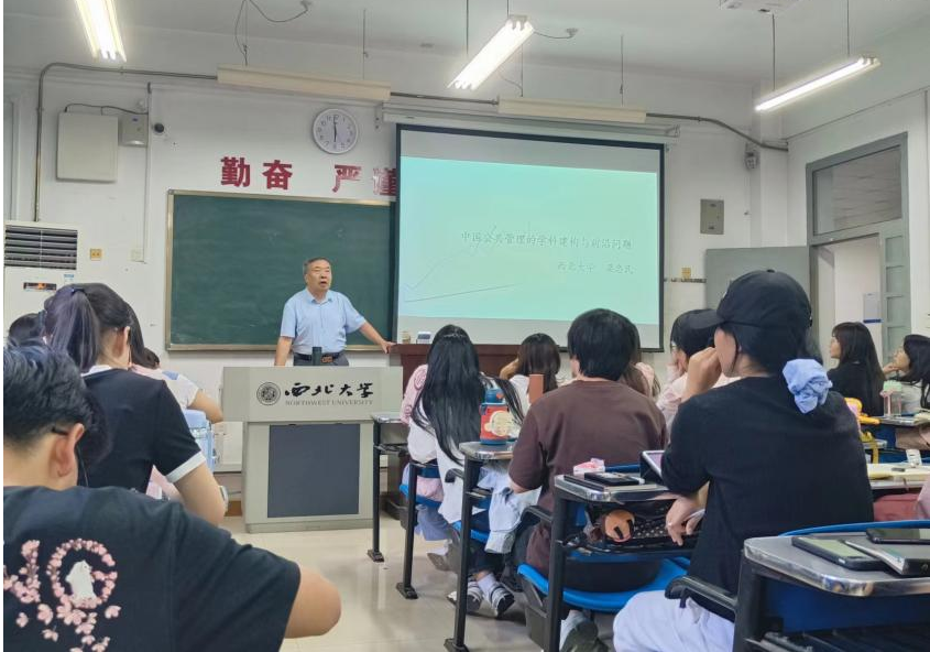2023年9月6日晚,西北大学565net必赢梁忠民教授在长安校区1209教室为我院2023级全体硕士研究生作了题为“中国公共管理的学科建构与前沿问题”的专题讲座。