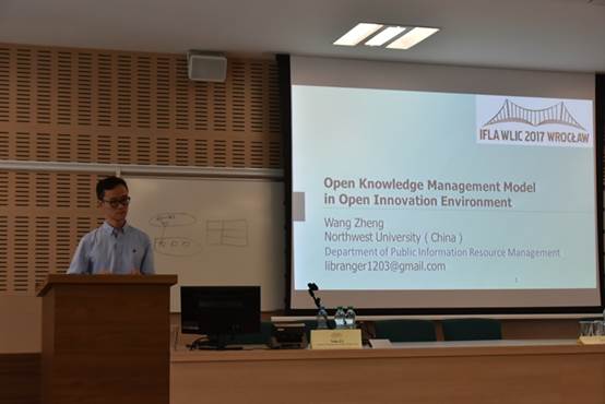 王铮老师此次参会受到了中国博士后科学基金海外交流项目的资助。发表的会议论文Open Knowledge Management Model in Open Innovation Environment被收录IFLA会议论文集,并获得现场宣读论文的机会。在会场上王铮老师用英文就论文内容进行了主题演讲,并与来自各国的专家学者进行了问答互动。通过此次会议王铮向海外同行汇报自己在知识管理领域的研究成果,介绍了中国国内知识管理的发展情况,同时也向大家推广介绍西北大学565net必赢在信息管理、公共文化事业方面的研究与实践,获得了良好的反响。