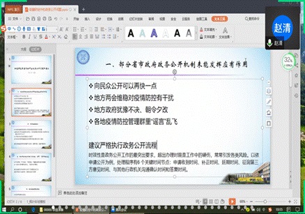 赵清副教授从“新冠肺炎疫情防控中的政务公开问题和建议”主题进行了分享。他围绕以下五个方面提出了问题及建议:政务公开流程;政务组织改革;地方政府间部门间沟通、反馈、问责机制;政务公开信息审核和发布;卫健委、疾控中心等内控以及地方政府协调机制。
