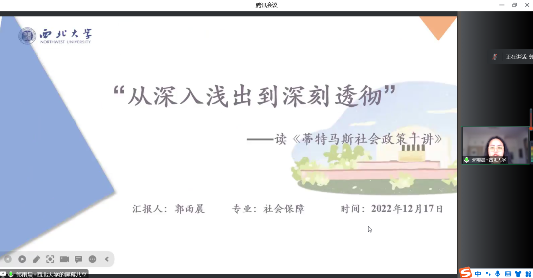 2022级社会保障专业硕士研究生郭雨晨分享的书目是英国理查德·蒂特马斯教授的《蒂特马斯社会政策十讲》。她的汇报主要从书籍信息、作者简介、创作逻辑、内容提要、核心内容及阅读感悟展开讲述,结合书籍主要内容层层推进。在汇报中,她提出本书主要从社会行政、社会福利、社会成本以及社会变迁等各个方面为我们解读了社会政策的深刻涵义,作为社会政策的入门读物,书中的一些概念界定和模型构建等都具有借鉴意义。同时,郭雨晨同学认为在研究社会政策的过程中,我们应注重研究的整体性、多元性和全面性,社会政策的研究不能独立于社会整体之外,我们要研究社会、经济和政治等各个方面。