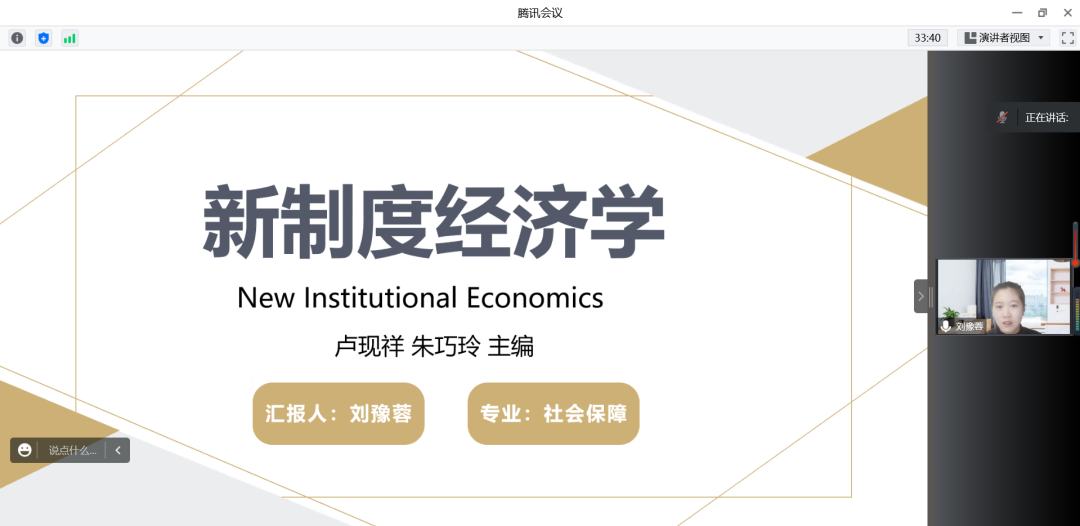 2022级社会保障专业硕士研究生刘豫蓉分享了卢现祥和朱巧玲主编的《新制度经济学》。她从作者简介、著作背景与目的、逻辑思路与框架、理论建构与研究方法、主要内容与观点、批判与反思、现实启示与运用七个方面进行分享。首先,她简要介绍了本书的作者与写作目的和背景。接着,她简要阐述了本书的逻辑思路与写作框架,对作者在书中运用的理论与研究方法进行了介绍。随后,在主要内容部分,她指出新制度经济学是一个侧重于交易成本的经济学研究领域,她详细介绍了《新制度经济学》的“十大问题”,并按照“制度基础——制度体系——制度变迁”的思路介绍了书的主要内容。最后,她提出了自己对本书的感悟和体会。