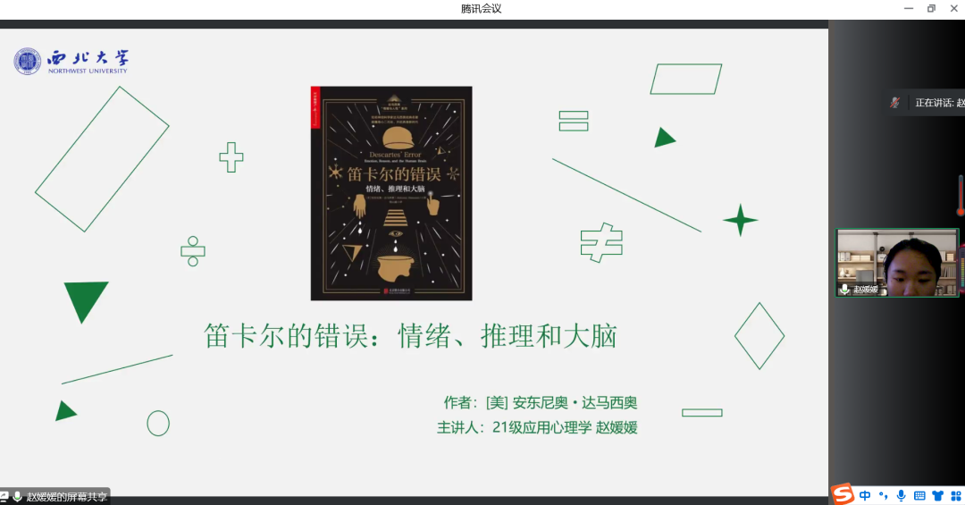 2021级应用心理学专业硕士研究生赵媛媛分享了美国南加州大学教授安东尼奥·达马西奥的《笛卡尔的错误:情绪、推理和大脑》,其汇报主要从人物简介,主要内容和书的现实意义展开讲述。汇报中,她着重分享了书中的三个重要概念:基本情绪,刺激情绪和躯体标记,同时强调二元论和躯体标记假设的主要区别。同时,她也提出理解心智与理性和躯体密不可分这一事实,有利于让我们更深刻地认识到自身的复杂性与独特性,成为整合躯体和大脑、与周围环境更高融合的互动的人。