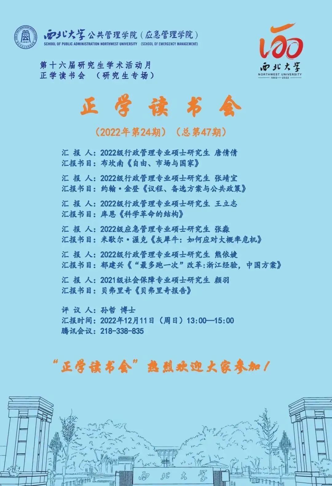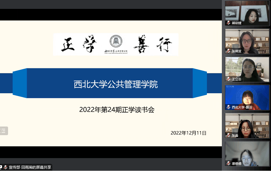 2022年12月11日下午,我院线上举办了2022年第24期正学读书会。2022级行政管理专业硕士研究生唐倩倩、2022级行政管理专业硕士研究生张靖宜、2022级行政管理专业硕士研究生熊依婕、2022级行政管理专业硕士研究生王立志、2022级应急管理专业硕士研究生张淼、2022级社会保障专业硕士研究生颜羽分别作为主讲人进行读书汇报,565net必赢2022级博士研究生孙哲担任评议人,部分研究生旁听了此次报告会。