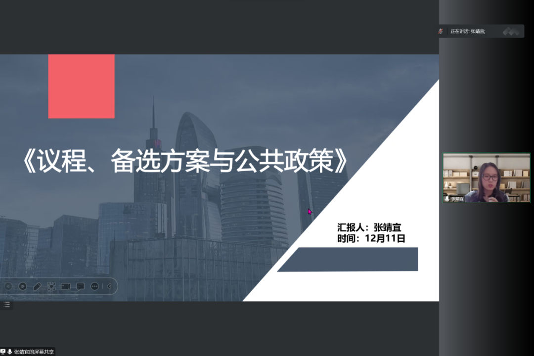 2022级行政管理专业硕士研究生张靖宜汇报了约翰·金登的《议程、备选方案与公共政策》,首先她介绍了本书的主要内容和作者简介。接着她从引言、政策参与者、政策过程、三股源流、政策之窗与源流的结合对本书的核心内容进行了论述,她重点阐述了多源流理论的内容——多源流理论将“垃圾桶模型”的四条源流整合成三条即问题源流、政治源流和政策源流。这三条源流是彼此相互独立的,金登继续将模糊性贯穿到这些源流分析之中,当三股源流聚集在一起的时候,“政策之窗”就开启了,促进这些不同源流之间融合的人员称之为“政策企业家” 。最后,她分享了自己的阅读感悟与体会。