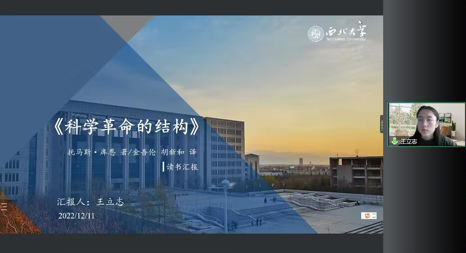 2022级行政管理专业硕士研究生王立志分享的书目是《科学革命的结构》,她从作者简介、写作背景、内容简述、核心思想、批判之声和个人收获六部分展开汇报。首先她围绕科学革命一词对全书进行了重新梳理,并阐释了科学革命范式转换的全过程以及解释了范式间的不可通约性。接着她分享了社会中部分人对库恩科学哲学思想的批判之声,包括对相对主义及真理的质疑。最后她结合科学革命范式及科学共同体的形成重新审视了本专业,并分享了自己的收获与启示。