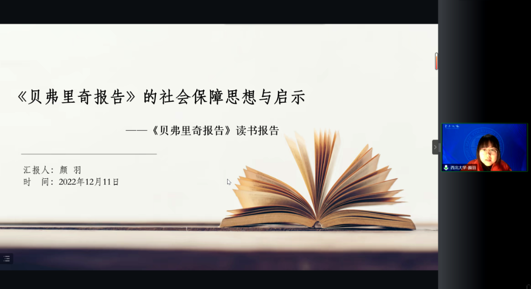 2022级社会保障专业硕士研究生颜羽分享的书目是《贝弗里奇报告》,她从作者简介、写作背景、主要内容、社保思想、总结启示这五个方面展开汇报。首先她简单介绍了作者以及写作背景。接着她从导言和概论、主要改革建议及理由、三个特殊问题、社会保障预算、社会保障计划、社会保障和社会政策六个部分对本书的主要内容进行介绍。最后她分享了本书中所包含的社会保障思想,并根据该书中的社保思想提出了该报告对我国社会保障制度建设的启示。