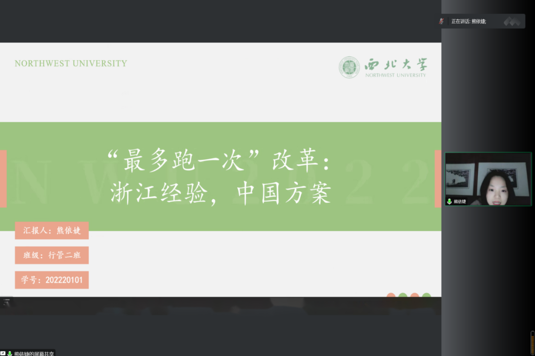 2022级行政管理专业硕士研究生熊依婕分享的书目是《“最多跑一次”:浙江经验,中国方案》,她从本书的作者简介、梗概和各章内容、贡献评价四个部分展开汇报。首先她简要介绍了本书作者郁建兴教授的任职经历和研究领域。接着论述了本书的写作背景和行文脉络,指出了本书所处的国际和国内的改革环境。在此基础上,她详细阐述了本书的主要内容,详细讲解了“最多跑一次”的缘起、撬动效应和政策创新扩散等内容。最后她深入分析了本书在理论和实践方面的价值贡献。