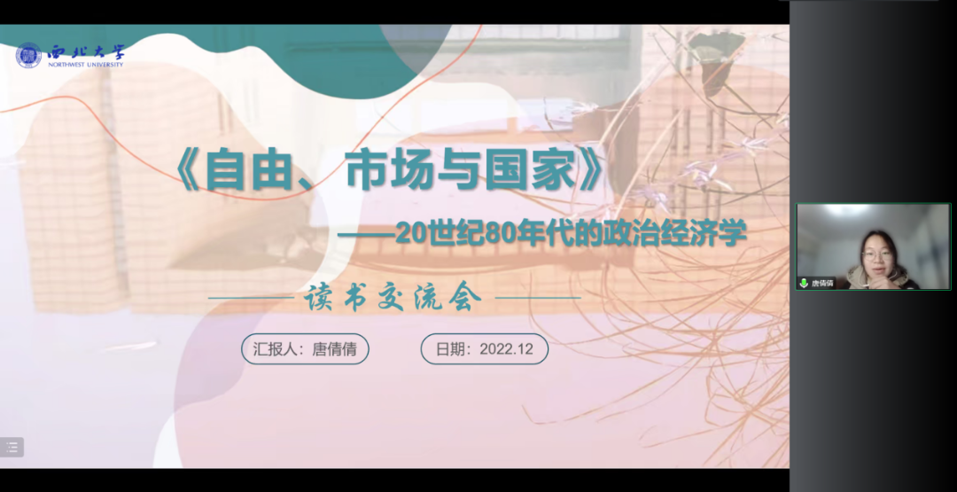 2022级行政管理专业硕士研究生唐倩倩分享的书目是布坎南的《自由、市场与国家》,她从作者简介、创作背景、主要内容、现实启示与心得体会五个部分展开汇报。首先她对本书的作者和创作背景进行了简单介绍。接着她从几种选择的观点、秩序的出现、正义理论的探究、负债和赤字的政治经济学以及个人与国家五个部分对该书的主要内容进行概括总结,并重点阐述了公共选择理论、道德秩序、道德共同体和道德无政府状态话题。随后她提出了公共选择理论对我国处理政府与市场关系的启示,最后分享了自己对于此次读书交流会整个过程的一些体会和感受,并分享了一些阅读小技巧。