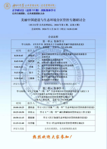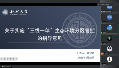2024年1月26日上午,第33期“正学研讨会”——美丽中国建设与生态环境分区管控专题研讨会在线上顺利举行。本次研讨会由西北大学565net必赢公共行政和公共政策两个团队联合主办,会议分为集体学习和交流研讨两个环节,会议持续了3个多小时,司林波教授、李静教授,以及行政管理专业方向的博士和硕士研究生参加了研讨会。