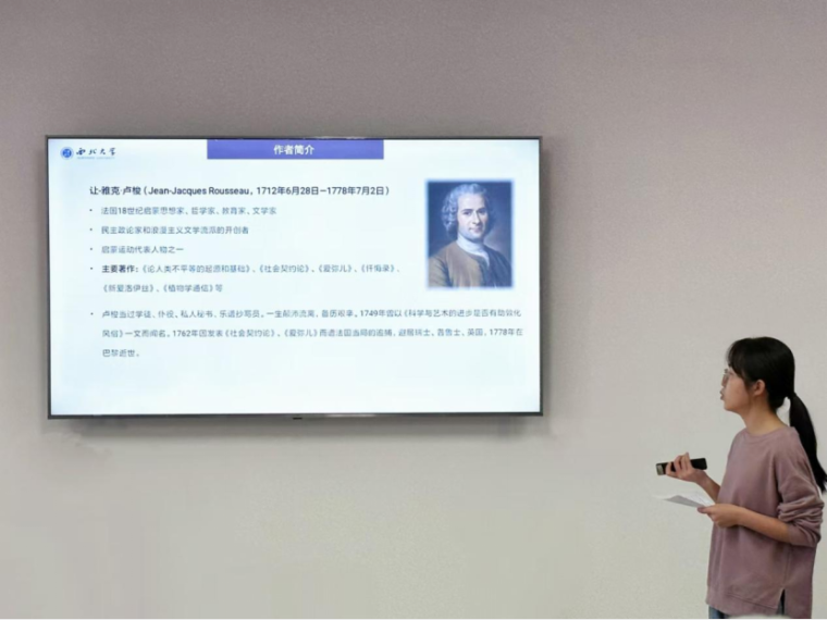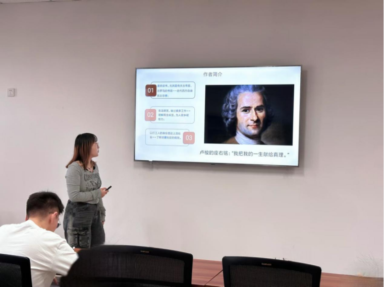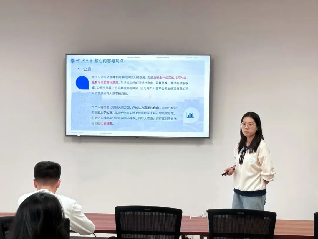 2023级行政管理专业硕士研究生王佳坤分享的书籍是卢梭的《社会契约论》。她从作者生平、内容概述、观点比较、理论影响四个部分进行汇报。卢梭自幼便喜好读书,但生活艰苦,曾混迹上流社会,为贵族工作。这些经历使他具有西方古典自由民主思想,且懂得民生疾苦,了解封建制度的腐败,也为他形成主权在民的思想奠定基础。本书中,他试图找到一个能把法律置于一切人之上的政府形式。他认为,在自然状态下,威胁人的生存障碍远超人维持生存的能力范围,因此人们签订社会契约,建立政治共同体。在社会契约这一概念的建构上,霍布斯的理论去道德化与神圣化,并提出“授权无悔”原则;而卢梭与洛克则认为政治具有道德价值,社会契约由全体成员签订,那么全体成员也有权收回。《社会契约论》对西方资本主义革命产生了深远影响。本书不仅在点燃革命烈火方面起到了极其重要的作用,也对政治哲学有深远影响,卢梭的政治观点为西方建立民主政治提供了思路,对政府建立的假设也成为政治哲学的重要理论。