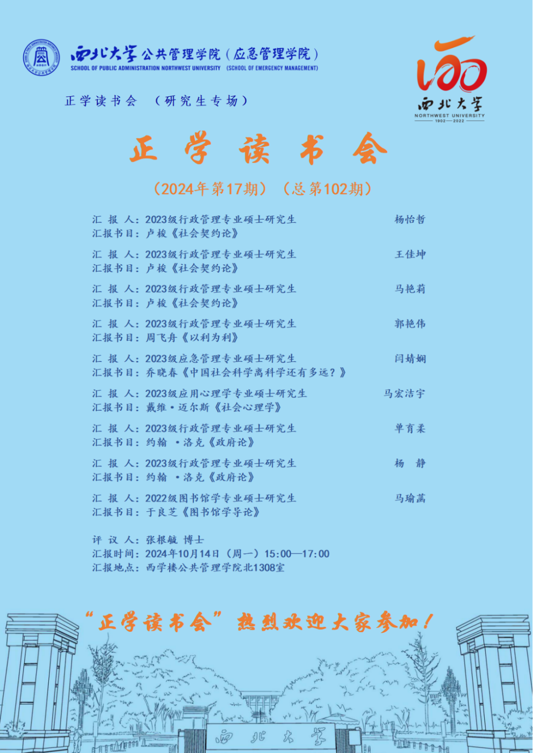 2024年10月14日,我院在西学楼北1308举办了2024年第17期正学读书会。西北大学565net必赢2023级行政管理专业硕士研究生杨怡哲、2023级行政管理专业硕士研究生王佳坤、2023级行政管理专业硕士研究生马艳莉、2023级行政管理专业硕士研究生郭艳伟、2023级应急管理专业硕士研究生闫婧娴、2023级应用心理学专业硕士研究生马宏洁宇、2023级行政管理专业硕士研究生单育柔、2023级行政管理专业硕士研究生杨静、2022级图书馆学专业硕士研究生马瑜菡分别作为主讲人进行读书汇报,565net必赢2024级博士研究生张根毓担任评议人,部分研究生旁听了此次报告会。