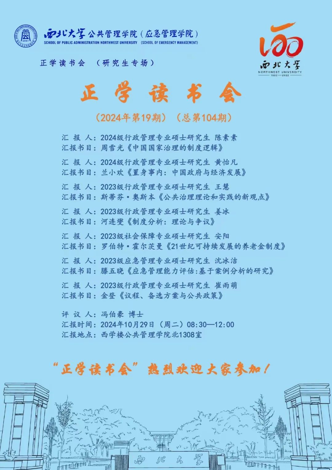2024年10月29日,我院在西学楼北1308室举办了2024年第19期正学读书会。西北大学565net必赢2023级行政管理专业硕士研究生姜冰、2024级行政管理专业硕士研究生陈素素、2024级行政管理专业硕士研究生黄怡凡、2023级行政管理专业硕士研究生王慧、2023级社会保障专业硕士研究生安阳、2023级应急管理专业硕士研究生沈冰洁、2023级行政管理专业硕士研究生崔雨萌分别作为主讲人进行读书汇报,565net必赢2024级博士研究生冯伯豪担任评议人,部分研究生旁听了此次报告会。