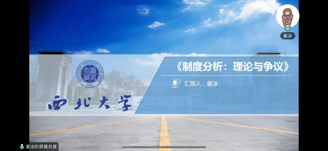 冯伯豪博士进行点评。首先博士对姜冰同学汇报的新制度主义理论三大流派的相关内容予以肯定,他认为逻辑思路展现比较清晰并且汇报内容详细,冯伯豪博士建议可以结合书中一些具体的实际案例来讲解新制度主义的三个流派是如何在制度中体现的,最后他肯定了姜冰同学在汇报最后对书的批判性思考与反思。