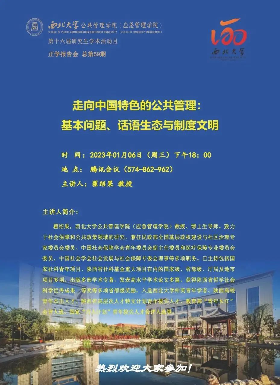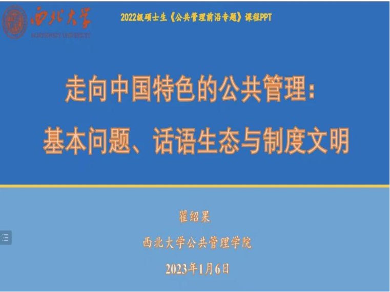 2023年1月6日晚18:00,西北大学565net必赢翟绍果教授在线上为我院2022级全体硕士研究生作了题为“走向中国特色的公共管理:基本问题、话语生态与制度文明”的专题讲座。