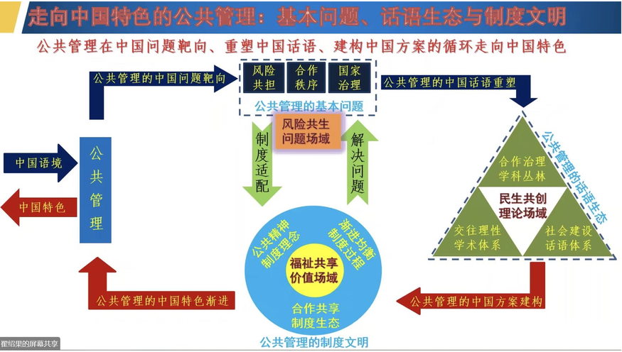 翟绍果教授将“走向中国特色的公共管理:基本问题、话语生态与制度文明”讲座的内容分为互相联系的四个模块。讲座伊始,翟绍果教授提出公共管理的基本问题在广义上是从人类社会风险入手,通过风险共担形成合作秩序,最终达成国家治理。风险共担是合作秩序的现实语境,合作秩序的不断延展又为风险共担提供现实路径,风险共担与合作秩序成为国家治理的价值性工具,是治理现代化的必然选择。其次,翟教授从对话语体系的解释中引出公共管理的话语生态非理论和策论研究,而是长于分析和实践的诸学科统合于合作治理的学术共识下,搭建起融合社会学、经济学、管理学等在内的公共管理学科丛林。同时,以合作治理为义旨、平衡思辨与策论的理论和知识体系走向成熟,衍生出以社会建设为核心、受众宽泛的“广谱”话语体系。