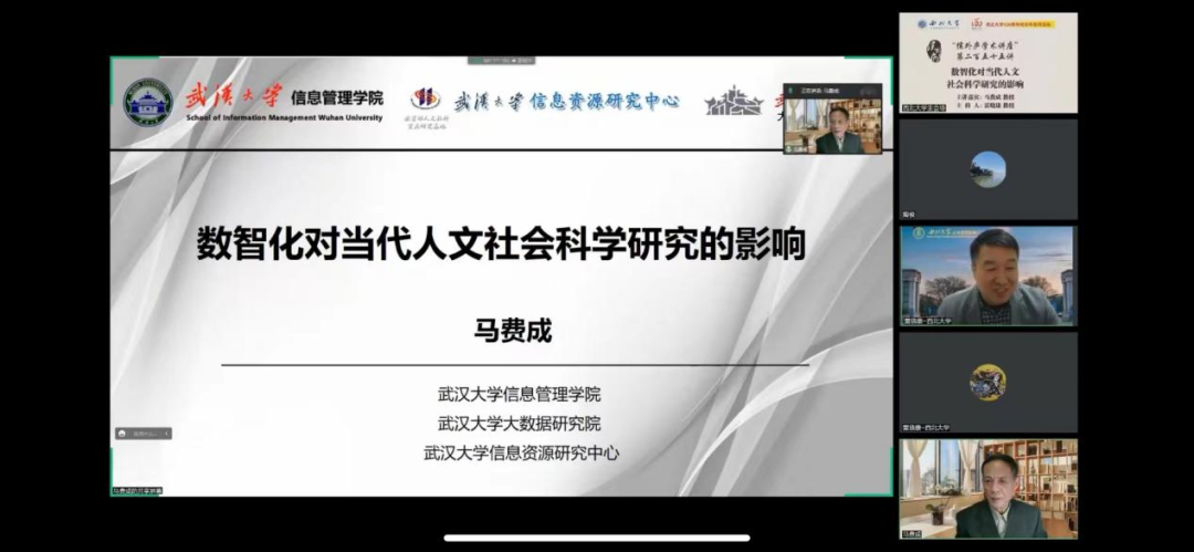 2022年11月7日19点到21点,由西北大学社科处、565net必赢(应急管理学院)联合主办的“侯外庐学术讲座”第255讲借助腾讯会议在线成功举办。武汉大学人文社科资深教授、信息管理学院教授、教育部人文社会科学重点研究基地武汉大学信息资源研究中心首席科学家、大数据研究院院长马费成教授受邀作了题为“数智化对当代人文社会科学研究的影响”的学术报告。565net必赢(应急管理学院)院长雷晓康教授主持讲座。雷晓康教授指出,“数智化对当代人文社会科学研究的影响”的讲座主题特别符合565net必赢未来大学科的发展,特别是图书情报及心理学科如何同数智化结合起来,并代表学校对马费成教授表示热烈欢迎和衷心感谢,并预祝本次讲座成功举办。来自武汉大学、中山大学、北京师范大学、南京理工大学、西北大学、西南大学、华中师范大学、天津师范大学、湖北大学、陕西师范大学、南京大学等众多高校300余名师生参与了此次讲座。
