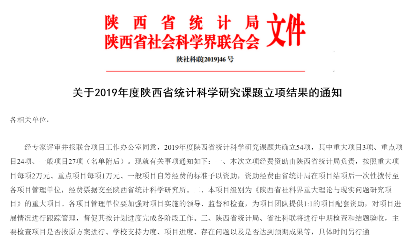 2019年度陕西省统计科学研究课题立项结果近期公布,共有54个项目批准立项,其中重大项目3项、重点项目24项、一般项目27项。雷晓康教授团申报的“陕西省居家养老服务供给流程与体系设计”课题获得重点课题立项资助。