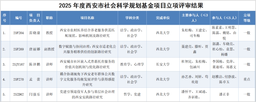 2025年4月25日,西安市社会科学规划基金管理办公室公示了2025年度西安市社会科学规划基金课题立项名单,其中基地共有5个项目获批立项。获批立项项目分别为:基地主任雷晓康教授主持的《西安市农村医养结合养老服务供需匹配现状、影响机制及路径研究》(项目编号:25FZ64),基地副主任唐丽娜副教授主持的《数字赋能与协同治理:西安市适老化公共服务精准供给的创新路径研究》(项目编号:25FZ69),基地成员陈泽鹏老师主持的《西安城市社区嵌入式普惠托育服务的价值共创机制与优化路径研究》(项目编号:25JY167),基地成员孟蕾老师主持的《耦合协调视角下西安老年群体公共数字文化服务均衡发展评价与获得感提升研究》(项目编号:25FZ70),基地成员闫强乐老师主持的《党建引领退役军人参与基层社会治理的西安实践路径研究》(项目编号:25ZD62)。