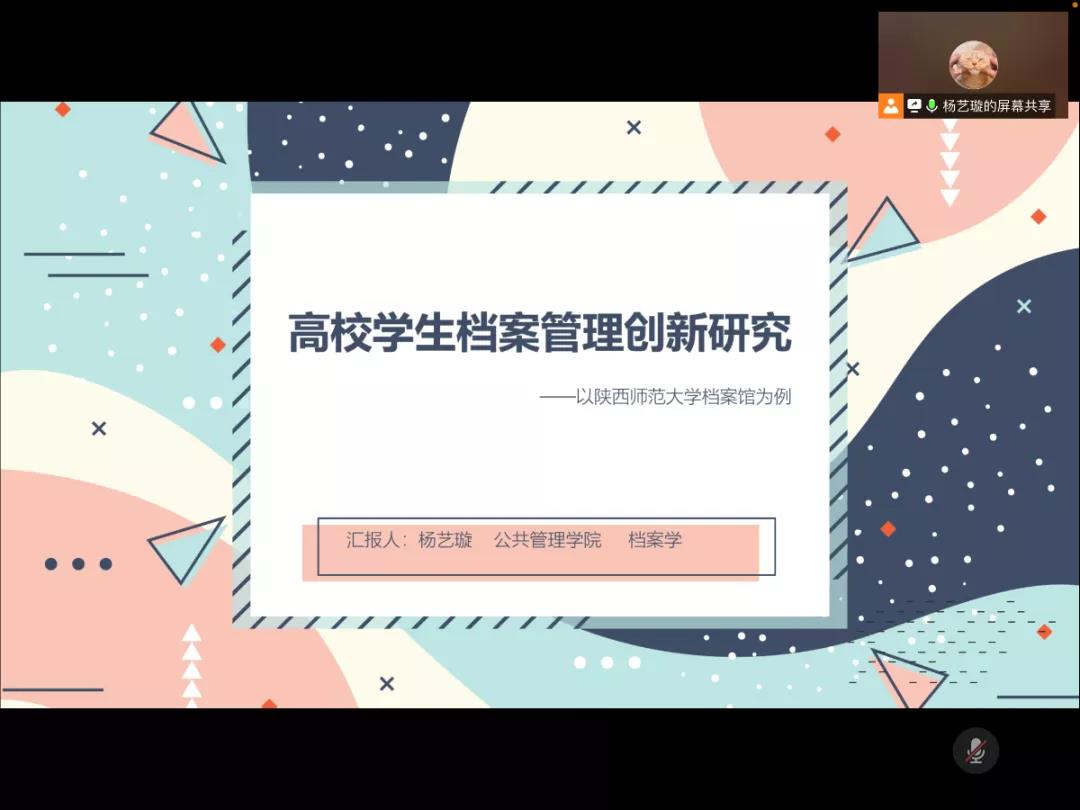 杨艺璇同学主要分享了关于《高校学生档案管理创新研究》,结合其在陕西师范大学档案馆实习经历与经验,并通过对各高校《学生档案管理办法》制度的网络调查与分析,提出学生档案工作在制度文本层面与业务工作中存在的问题,新时代人事档案背景也对高校学生档案工作提出了精细化、信息化、人性化的要求,以及转变利用服务意识的要求,最后以陕西师范大学档案馆为例,总结了该馆在应对新时代背景下作出的创新转变,推行集中统一管理的模式,创新管理技术、管理制度以及信息化服务等创新举措。