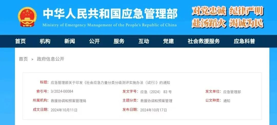 2024年10月17日,应急管理部印发《社会应急力量分类分级测评实施办法(试行)》(以下简称《办法》)。