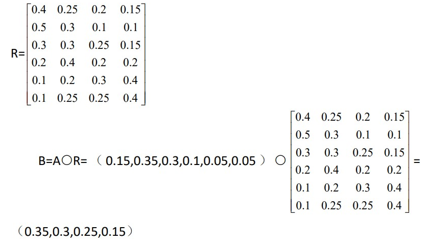 如果已给出决策矩阵R,再考虑各因素的重要程度,即给定隶属函数或权重集A,则模糊综合决策模型为: