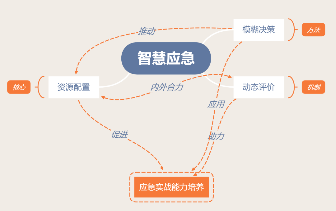 新型信息时代的到来,推动了传统突发事件处置向智慧应急协同处置的转变,为全方位人机交互的智慧应急提供了更多力量,也使得突发事件应急处置的发展有了更多的可能性。但外力的发展仍需内核的发展形成合力,最终为应急管理应用层及教学层搭建一体化的平台。这个转化过程中可以发现如何更加合理有效的对突发事件过程进行分析和评价将是最难的一环,同时这一环也将促进产学研进一步的发展,能够让实践与教学之间的桥梁更短、更快。接下来本文将从智慧应急的方法、机制和核心三个层面进行阐述,探索实现智慧应急在教学与应用中的生态搭建。