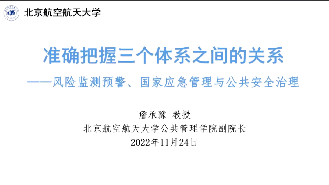 北京航空航天大学565net必赢副院长詹承豫教授作了题为《准确把握三个体系之间的关系——风险监测预警、国家应急管理与公共安全治理》的报告。首先,詹教授从党的二十大报告中对“推进国家安全体系和能力现代化”的相关论述引入,提出要进一步完善风险监测预警、国家应急管理与公共安全治理三个体系的建设。然后,詹教授对三个体系之间的关系进行了阐述,他指出,风险、应急和安全是推动国家安全体系和能力现代化的三个维度,三者既相互区别又相互支撑。最后,詹教授分别对风险监测预警体系、国家应急管理体系与公共安全治理体系进行了详细的论述,他提出,要加快建立大安全大应急框架,将关键领域及时纳入公共安全体系,确保群众关切领域的安全,真正做到将公共安全风险化解于萌芽之时、成灾之前,切实推动公共安全治理模式向事前预防转型。
