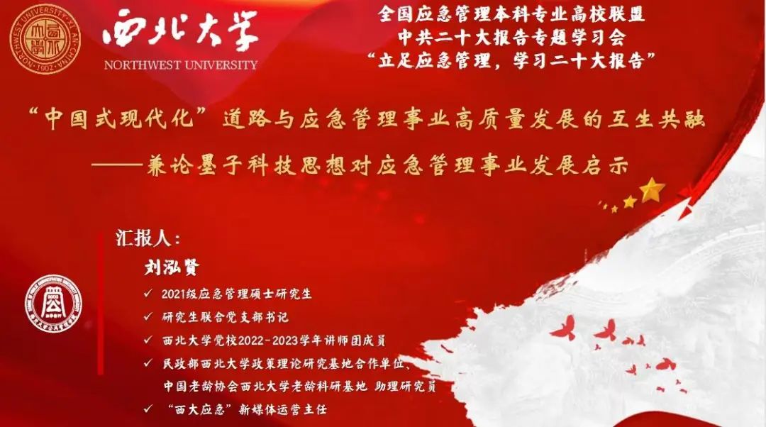 2021级应急管理硕士研究生刘泓贤作了题为《“中国式现代化”道路与应急管理事业高质量发展的互生共融——兼论墨子科技思想对应急管理事业发展启示》的报告。刘泓贤同学首先基于“政策-制度”视角解读了党的二十大的宏观意义,接着通过中西现代化理路对比指出“中国式现代化”是人类文明新形态的创新探索,进而厘清中国式现代化”道路与应急管理事业高质量发展的辩证关系;同时,他提到要以“五个坚持”的重要原则推动中国特色应急管理事业高质量发展。最后,通过梳理和发掘中华优秀传统文化中的墨子科技思想对智慧应急建设和发展有所助益的部分,助力智慧应急发展。