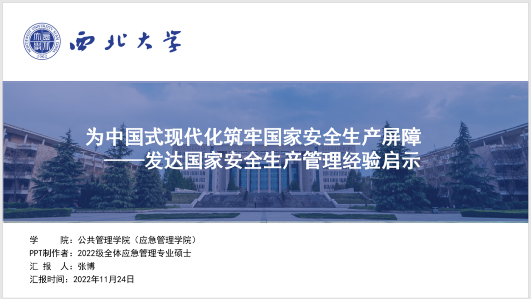 2022级应急管理硕士研究生张博代表2022级全体应急管理硕士研究生作了题为《为中国式现代化筑牢国家安全生产屏障——发达国家安全生产管理经验启示》的报告。首先,主要陈述了党的二十大报告中对于“安全”和“国家安全”的论述,并且梳理了近二十年安全生产事故起数和死亡人数数据统计。接着,分别从国外法律标准、全员参与、工伤保险制度以及德国“零愿景”文化四个方面介绍了发达国家在安全生产方面的先进经验。最后,分享了此次学习的启示:要坚持以人为本,推进社会各方关注参与安全生产;加强文化建设,营造安全生产文化氛围。指出在借鉴别国发展经验时,要充分考虑到我国在主要突发事件类型和体制机制上的特异性,应立足自身特点和实际情况出发。