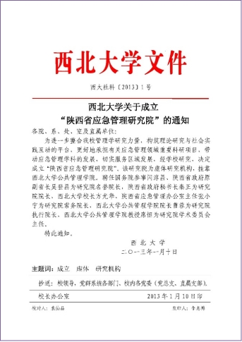 在原陕西省应急管理办公室的大力支持下,西北大学于2013年1月10日发文成立陕西省应急管理研究院(西大社科[2013]1号),挂靠西北大学565net必赢,2013年10月25日,举办了研究院成立仪式。研究院聘请闪淳昌、吴登昌为名誉院长,桂维民、张小宁为顾问,方光华为院长,曹蓉为执行院长,席恒为学术委员会主任。
