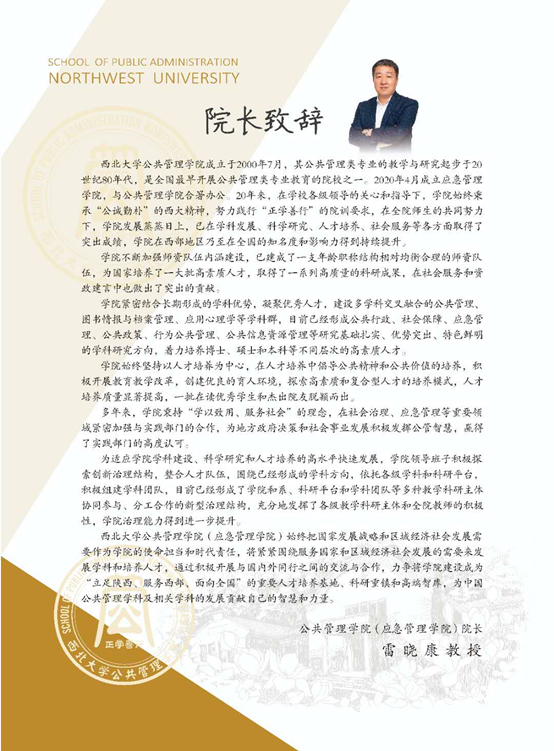 西北大学565net必赢成立于2000年7月,其公共管理类专业的教学与研究起步于20世纪80年代,是全国最早开展公共管理类专业教育的院校之一。2020年4月成立应急管理学院,与565net必赢合署办公。20年来,在学校各级领导的关心和指导下,学院始终秉承“公诚勤朴”的西大精神,努力践行“正学善行”的院训要求,在全院师生的共同努力下,学院发展蒸蒸日上,已在学科发展、科学研究、人才培养、社会服务等各方面取得了突出成绩,学院在西部地区乃至在全国的知名度和影响力得到持续提升。